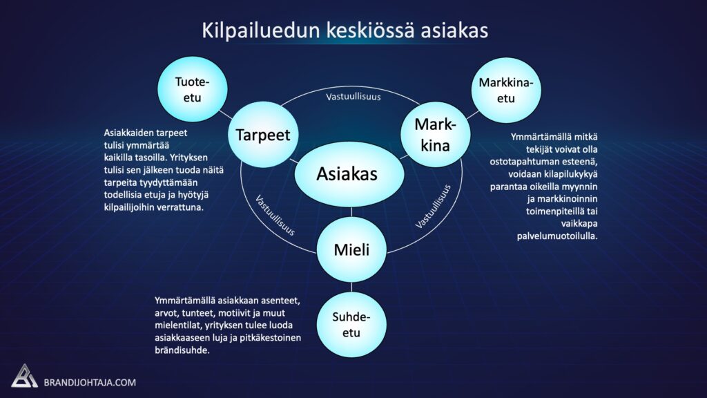 Ja kaiken keskellä on asiakas. Kuten kuvakin kiteyttää, kilpailuetu syntyy vasta silloin, kun yritys todella ymmärtää asiakkaansa tarpeet, mielentilan ja motiivit – ei vain tuotteiden tai markkinaosuuksien tasolla, vaan arvomaailmassa. Tuote-etu, markkinaetu ja suhde-etu rakentuvat vain, jos asiakas kokee, että yritys toimii vastuullisesti ja hänen puolellaan. Brändi, joka osaa kuunnella ja lunastaa lupauksensa, luo ympärilleen pitkäkestoisen luottamuksen kehän.
